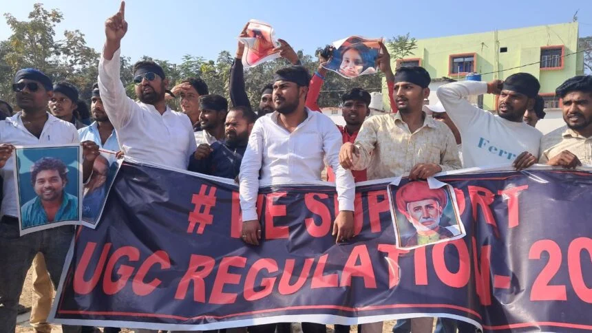 मधेपुरा/बिहार : बुधवार को भूपेंद्र नारायण मंडल विश्वविद्यालय परिसर में यूजीसी नियम के समर्थन में बड़ी संख्या में छात्रों और नौजवानों का जुटान हुआ, जहां से छात्र और नौजवानों का हुजूम यूजीसी नियम के समर्थन में अपनी आवाज बुलंद करते हुए कॉलेज चौक होते हुए कला भवन परिसर तक पहुंचा और सभी ने एक स्वर में यूजीसी नियम को सभी उच्च शिक्षण संस्थानों में सख्ती के साथ लागू करने की मांग की।